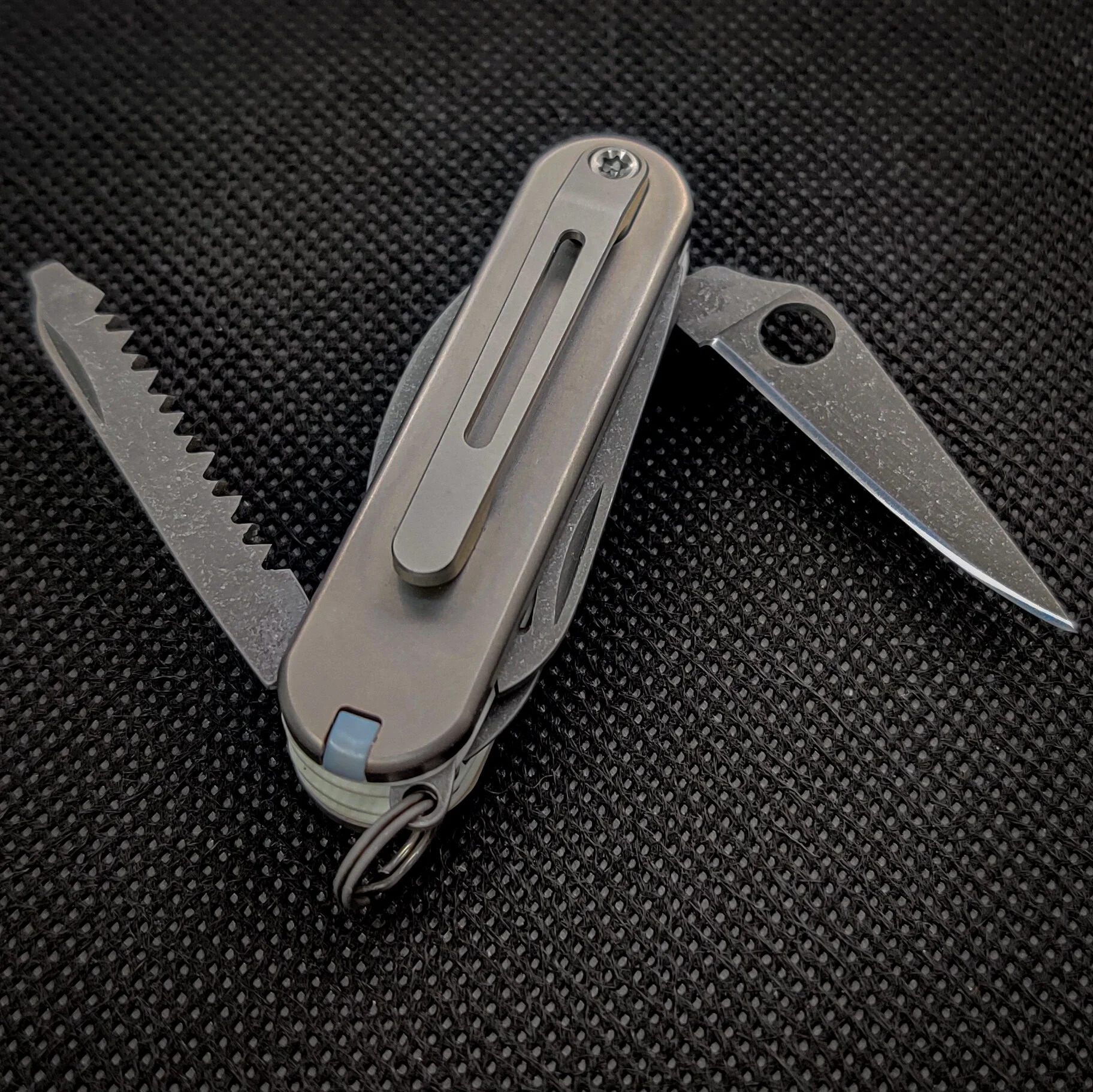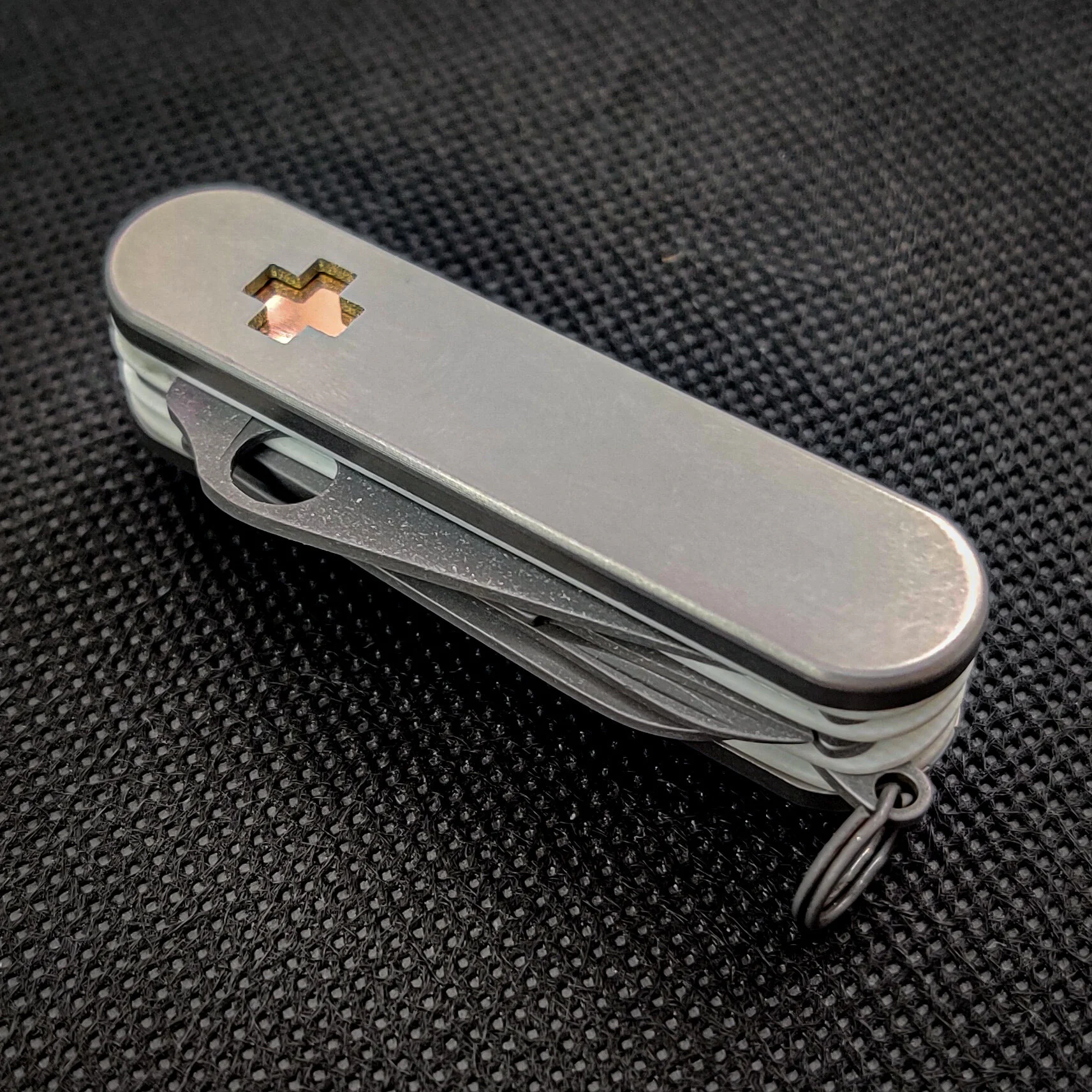 The base of this build is a Victorinox Minichamp. I replaced the original blade with a Spyderco Honeybee, added my signature saw mod and removed a couple of unwanted tools. All of the tools were acid etched and aluminum washed. The liners are white G10 and the scales are titanium with a copper plate peeking behind the “plus” logo.