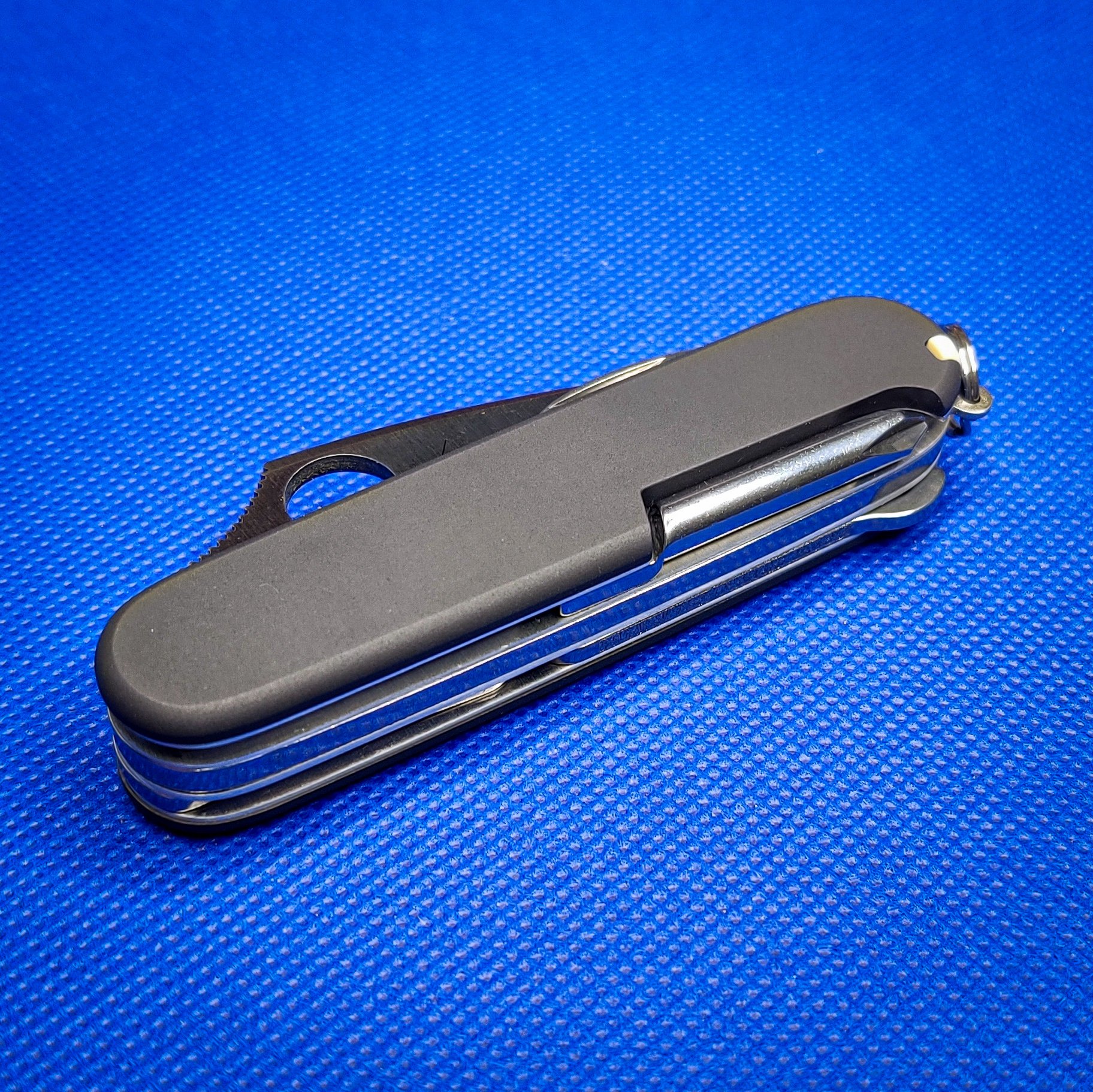 The base for this build was a Victorinox Compact. A Spyderco Dragonfly 2 blade replaced the original blade and pliers were added making the “Mechanic Jr.” toolset. The liners are original aluminum that have been polished and the scales are flamed titanium.
