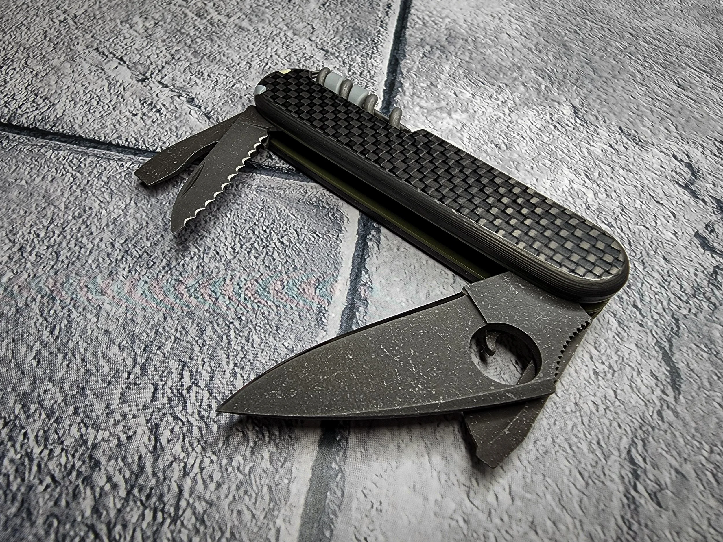 The base for this build was a Victorinox Spartan. The large blade was replaced by a Spyderco Dragonfly and the small blade was serrated. The tools were acid etched and aluminum washed. The liners are OD green G10 and the scales are carbon fiber plus scales.