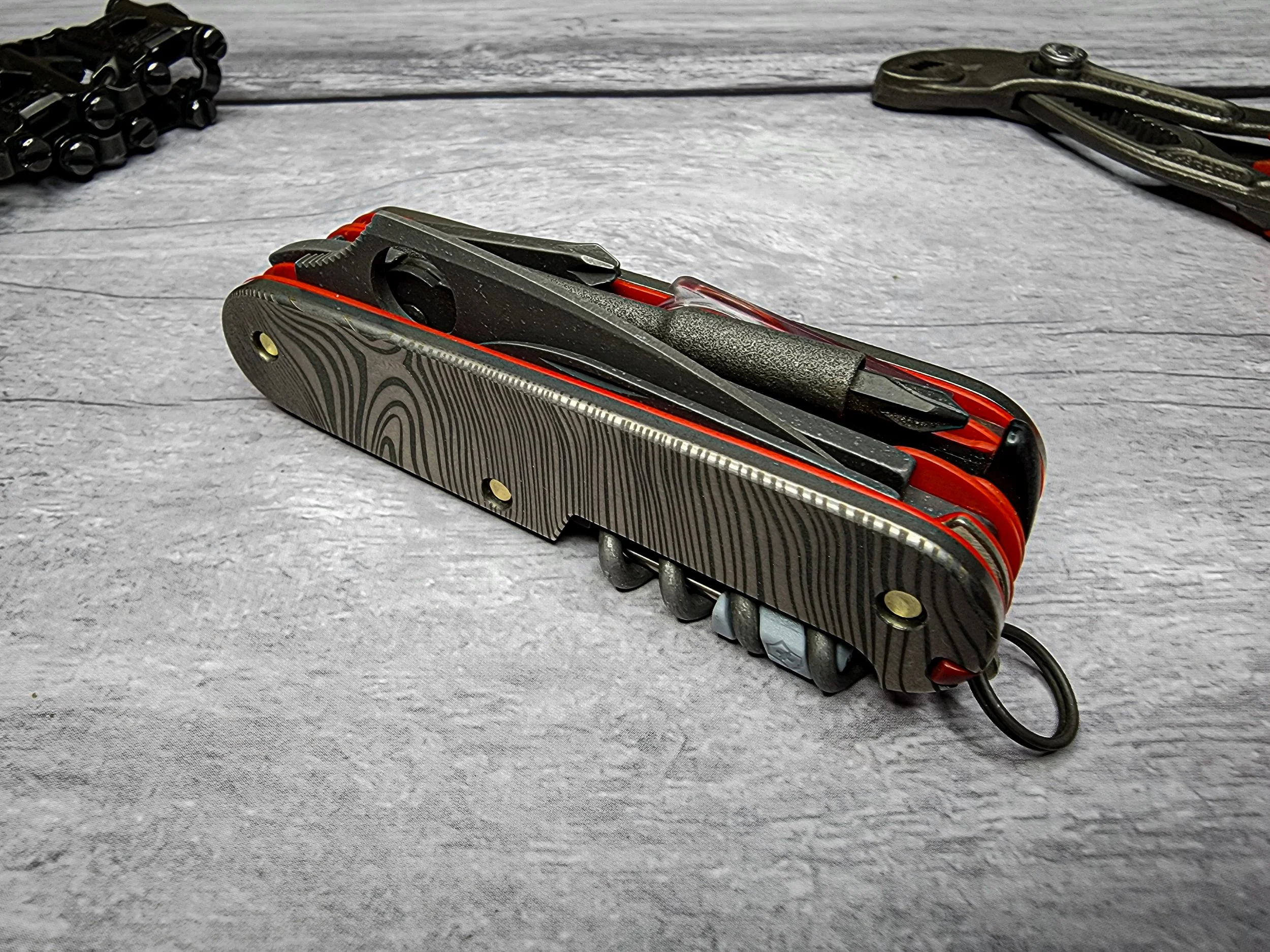 The base for this build was a Victorinox Cybertool M. The scissors layer was removed, the inline phillips and magnifying glass were added from a Victorinox Explorer and a Spyderco Dragonfly 2 blade replaced the original blade. The tools have all been acid etched and aluminum washed and the liners are red G10. The scales are titanium with a laser engraved timascus pattern.