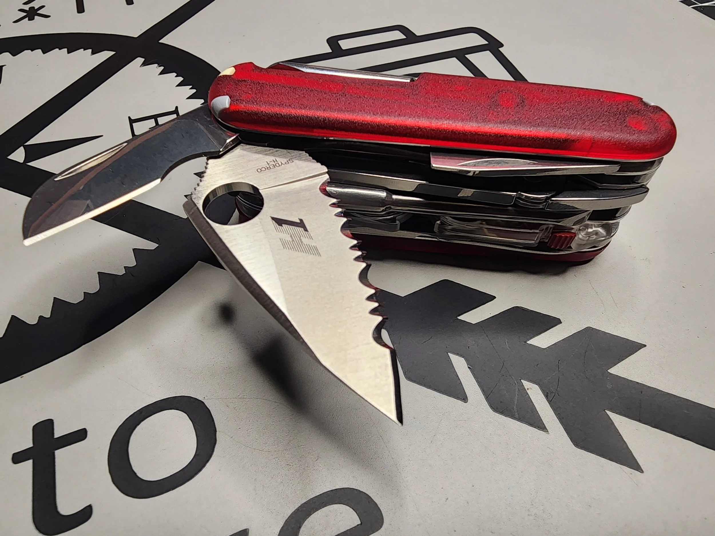 This build is based on the Victorinox Cybertool Lite. The Spyderco Dragonfly 2 H1 was added on a layer of it’s own and the electrician blade was placed opposite of the bottle opener. The liners are polished aluminum and the scales are original Victorinox Electronic.