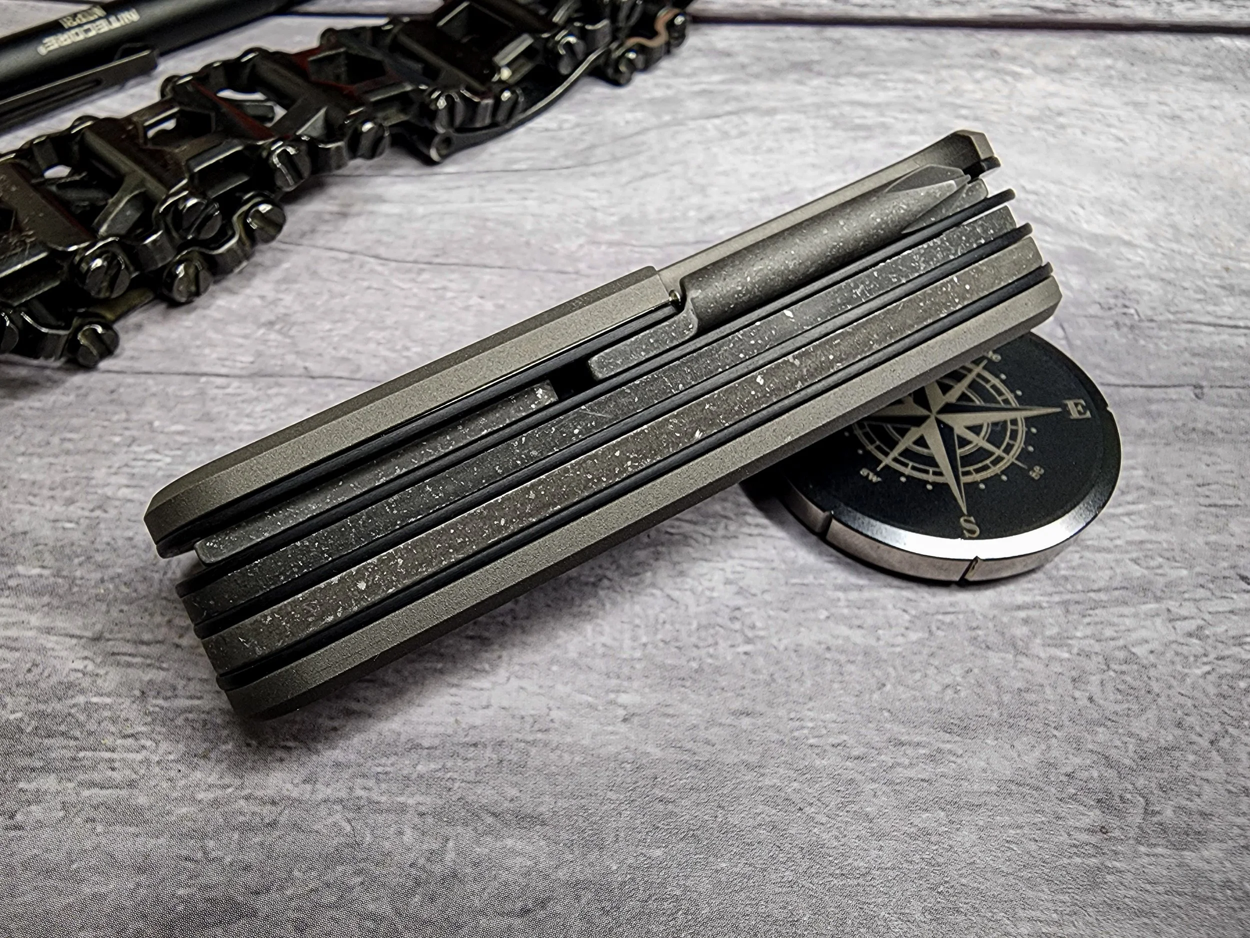 This build is based on the Victorinox Deluxe Tinker. The Spyderco Dragonfly 2 was added on a layer of it’s own and electrician blade was placed opposite of the bottle opener. The tools were acid etched and aluminum washed. The liners are black G10 and the scales are Metanboss titanium.
