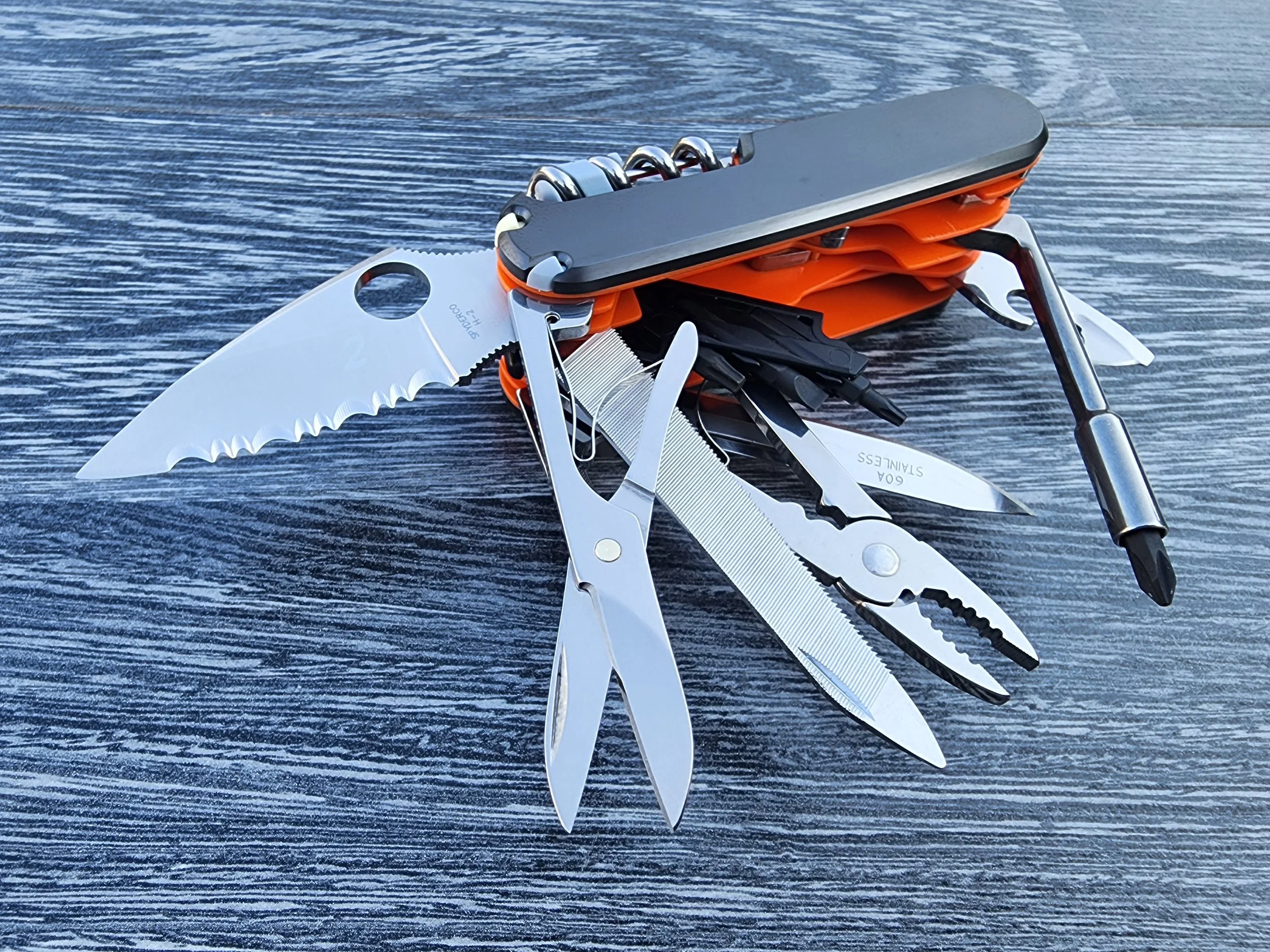 This build is based on the Victorinox Cybertool L. The Spyderco Dragonfly 2 H1 and Havalon scalpel holder were added. The liners are orange G10 and the scales are Metonboss zirconium plus scales.