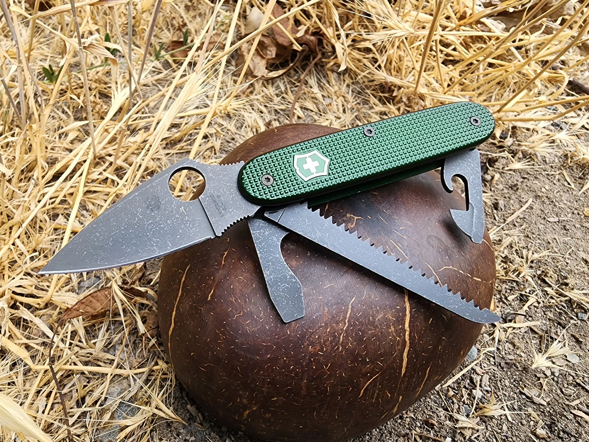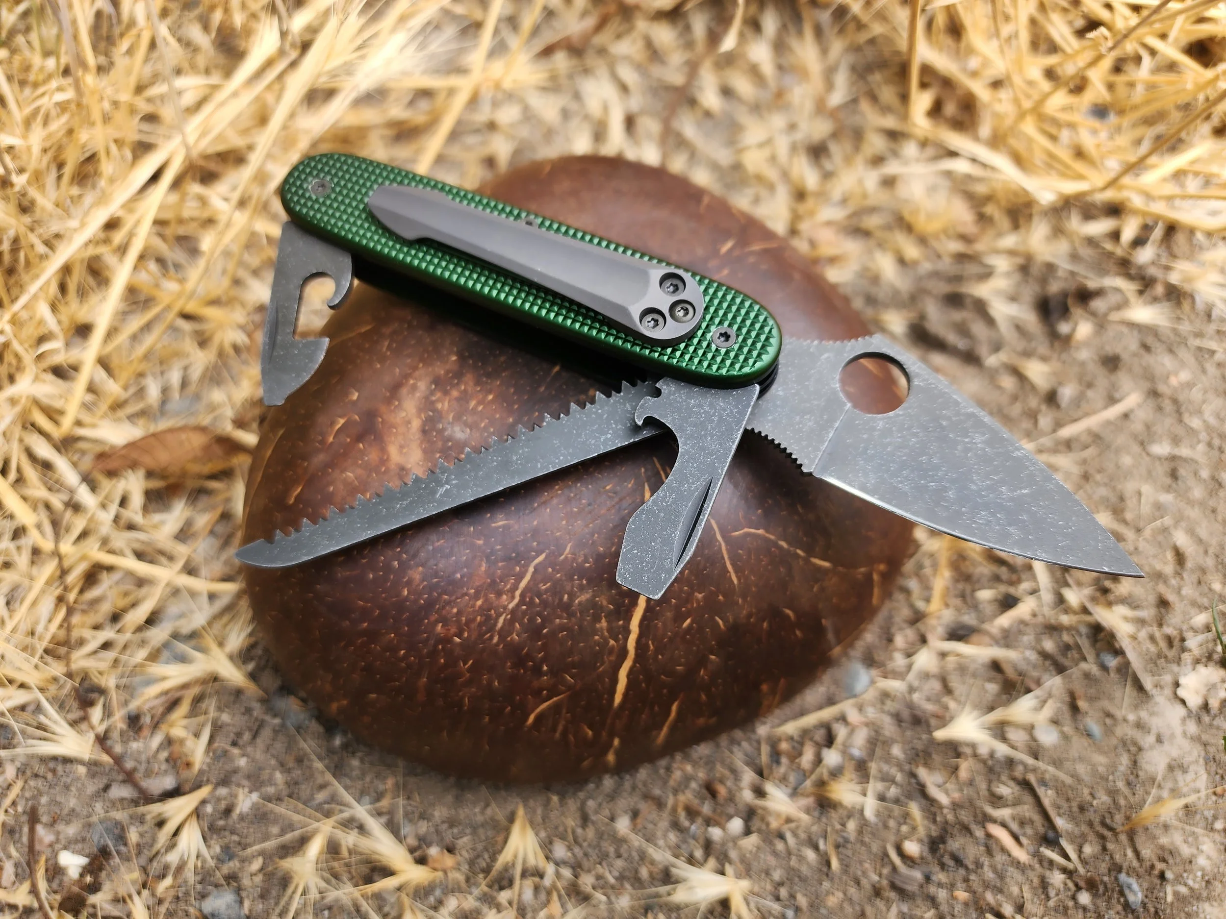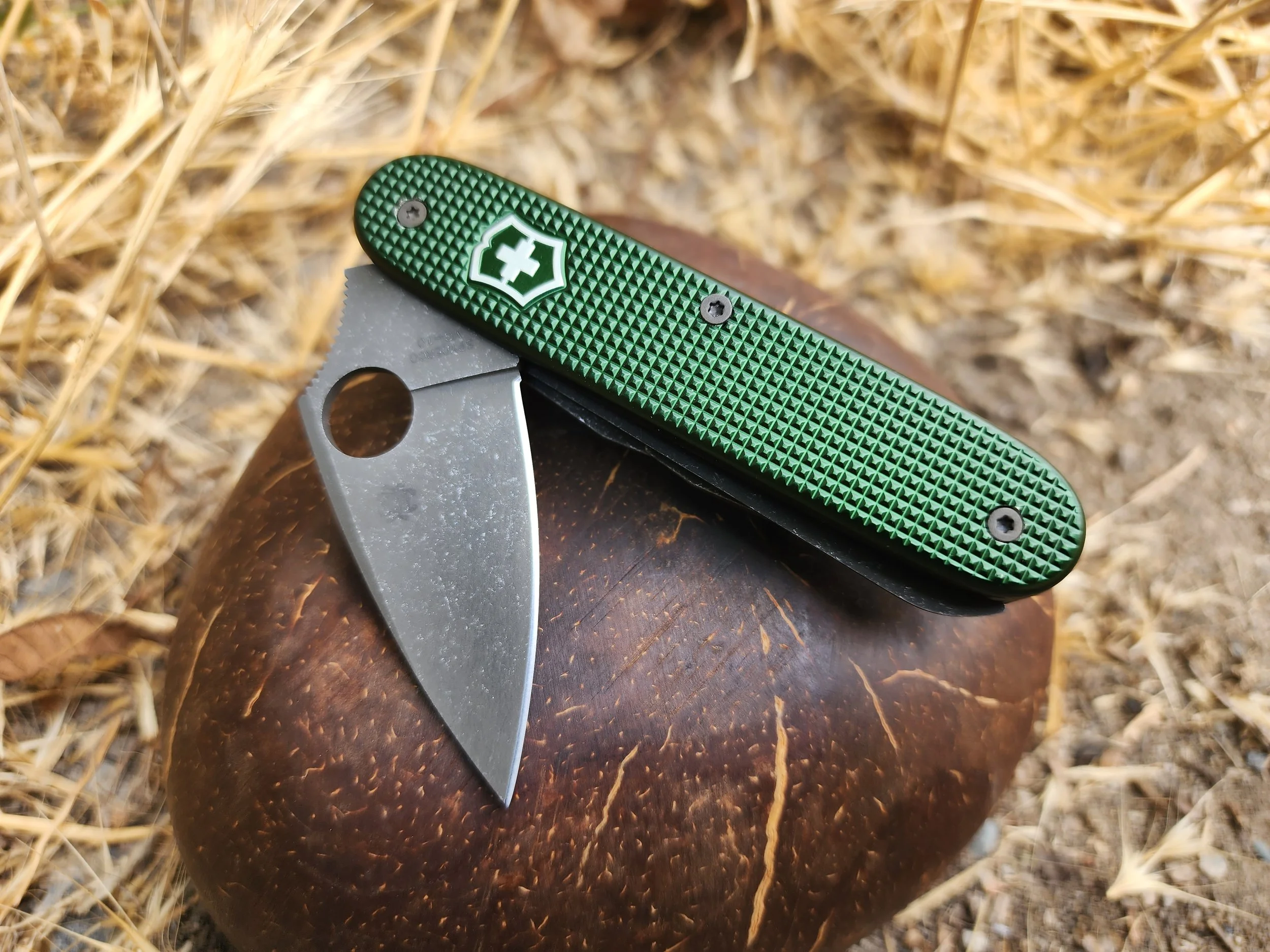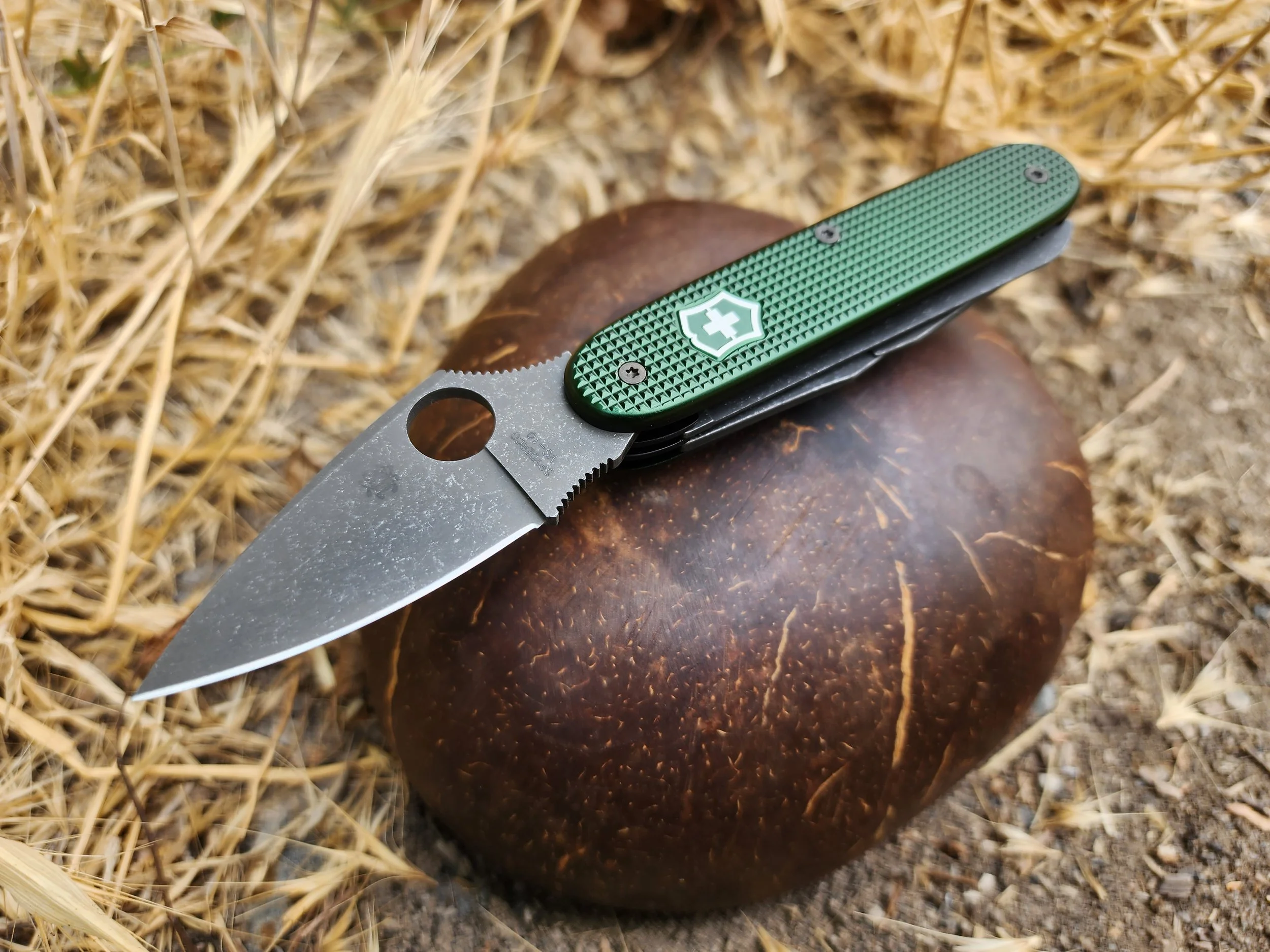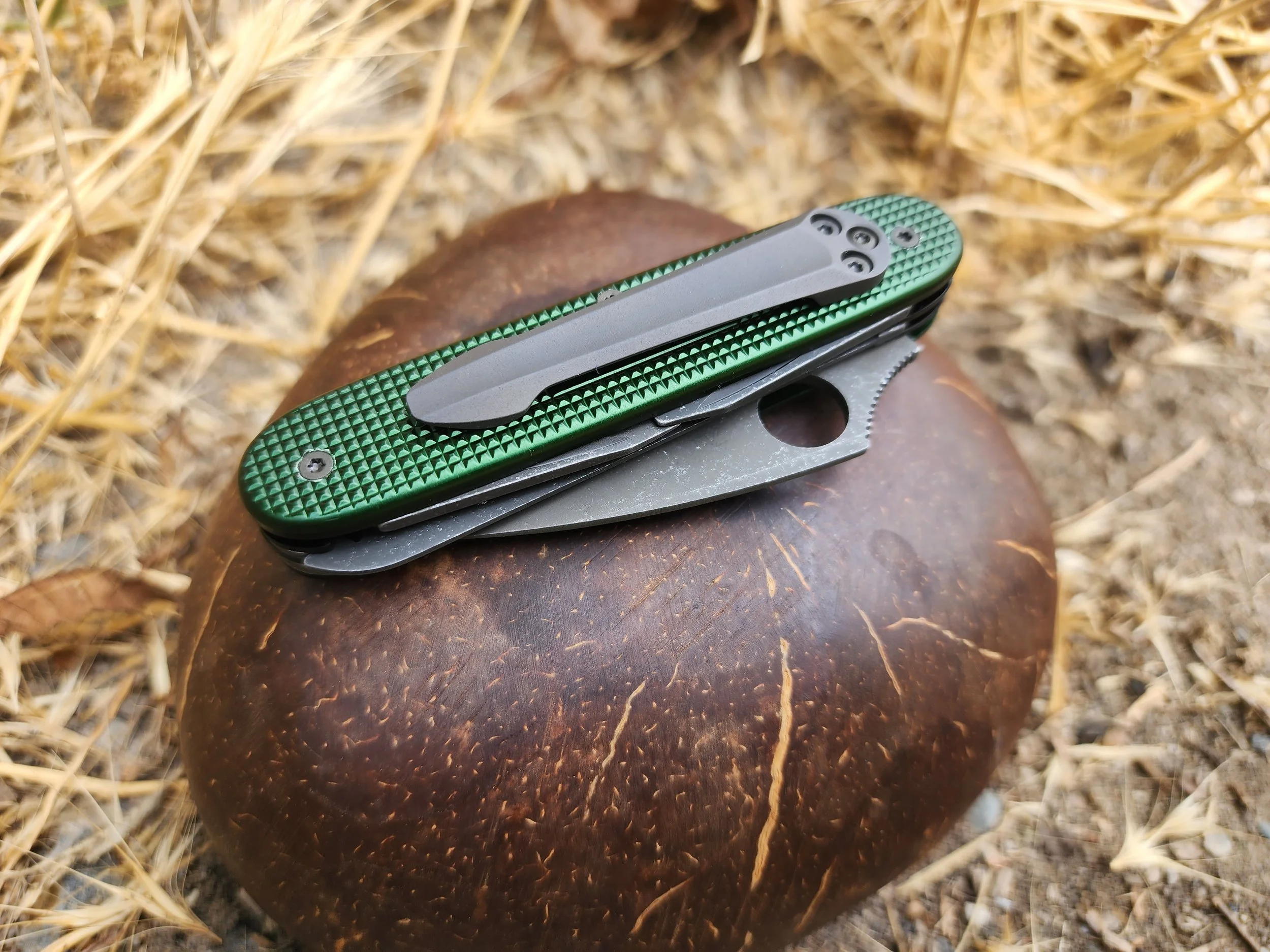 This build is based on the Victorinox Farmer. The Spyderco Dragonfly 2 was added on a layer of it’s on. The tools were acid etched and stone washed. The liners are black G10 and the scales are original Victorinox green alox with a titanium pocket clip.