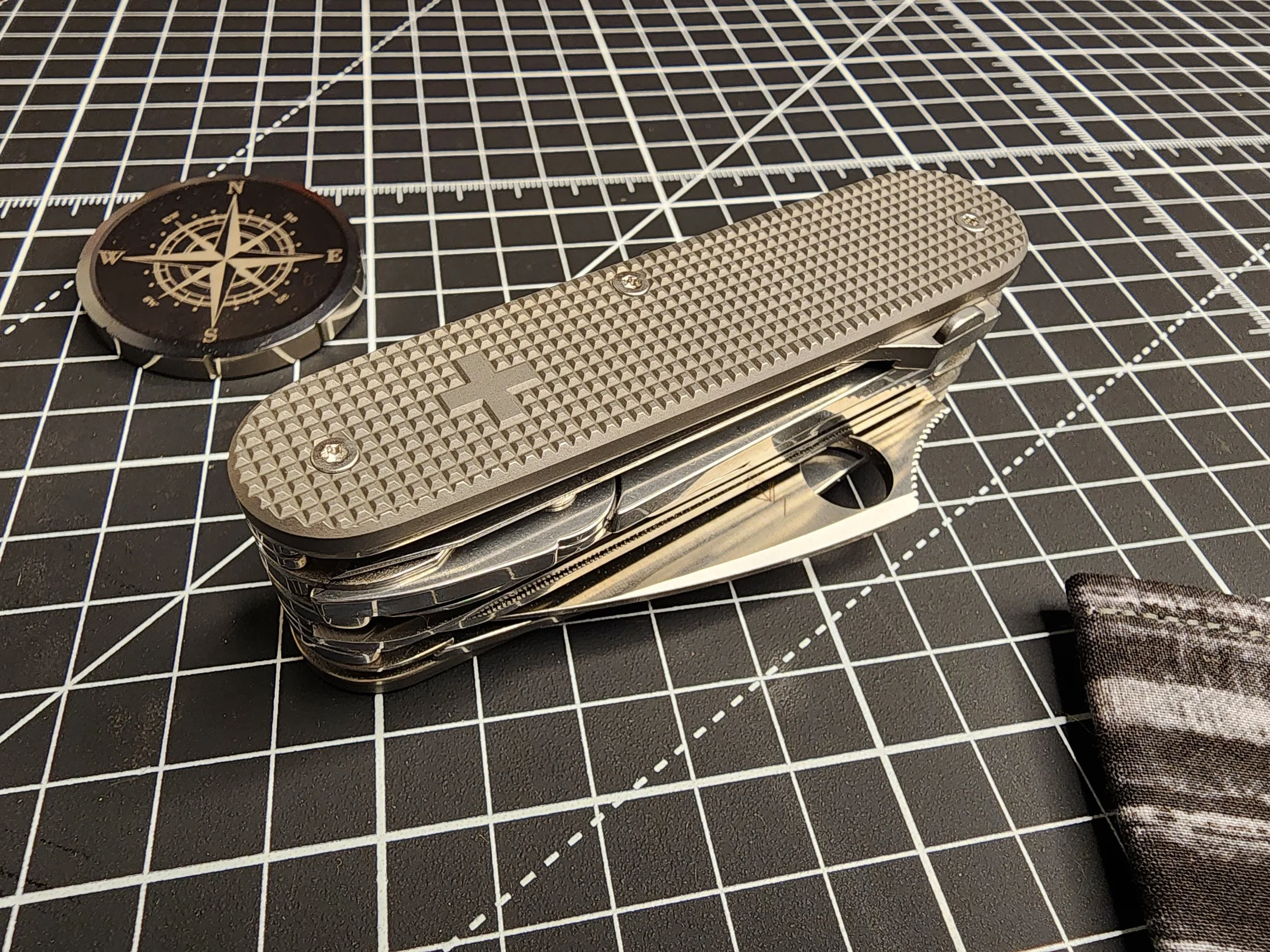 This build is based on the Victorinox Handyman. The Spyderco Dragonfly 2 was added on the layer of it’s own and Havalon scalpel holder was added. The liners are titanium and scales are W3rktrieb titanium with a torx screws.