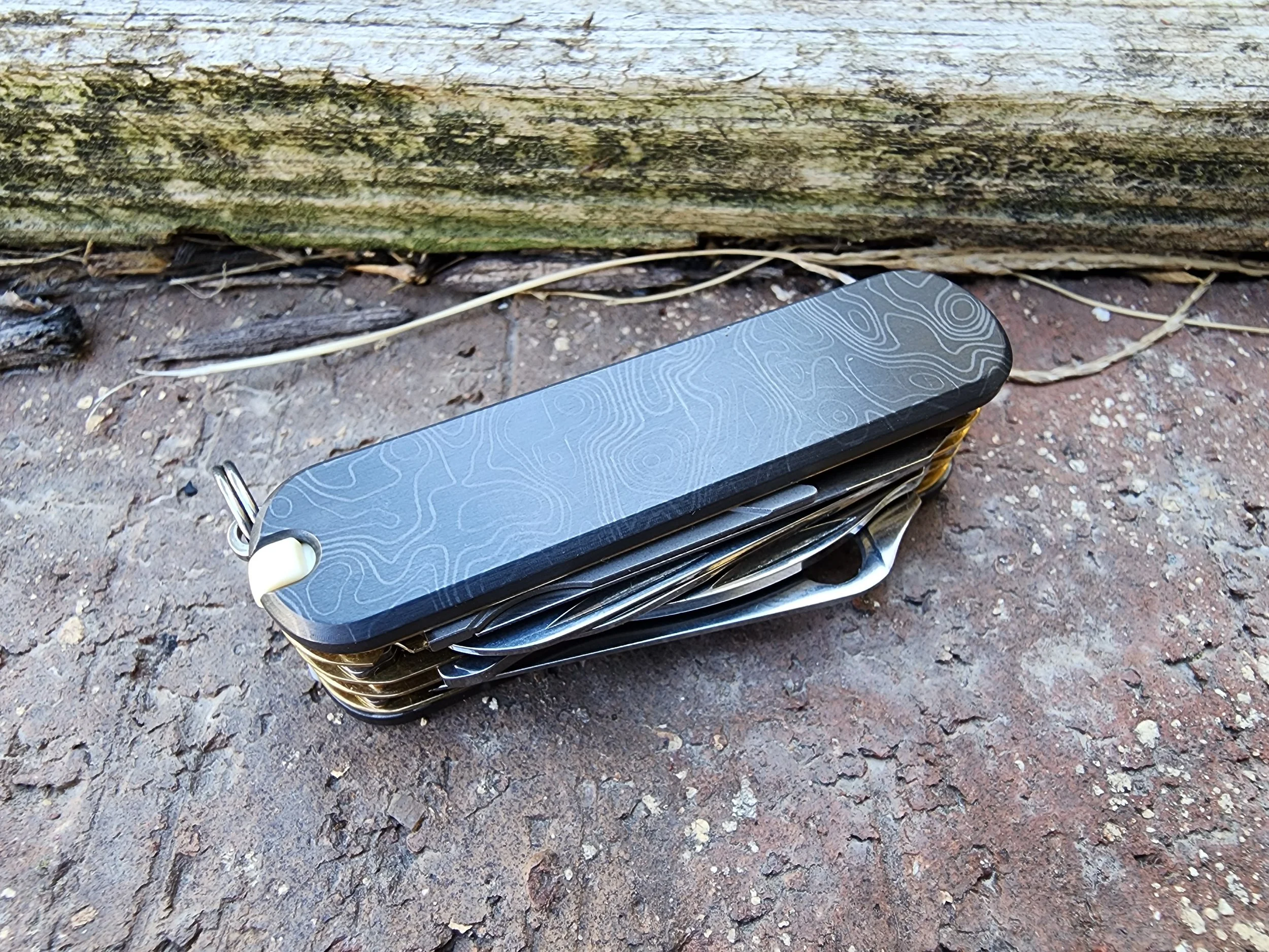 This build is based on the Victorinox Minichamp. The original blade was replaced with the Spyderco Honeybee and Nitecore Scalpel Holder was added as well. The saw mod and tick removal mod and a serrated blade were added. The liners are brass and scales are Metonboss zirconium with a topographic pattern.
