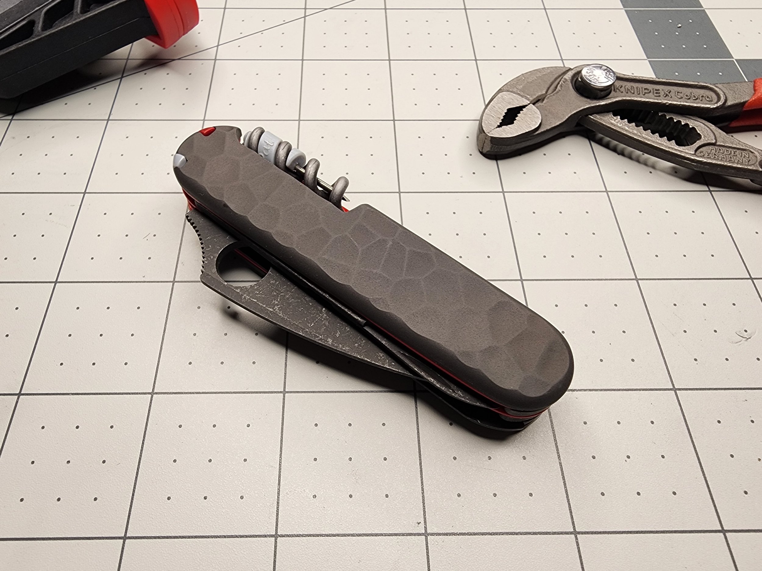 This build is based on the Victorinox Huntsman. The Spyderco Dragonfly 2 was added on a layer of it’s own. The tools were acid etched and stone washed. The liners are red G10 and liners are flamed titanium plus scales.
