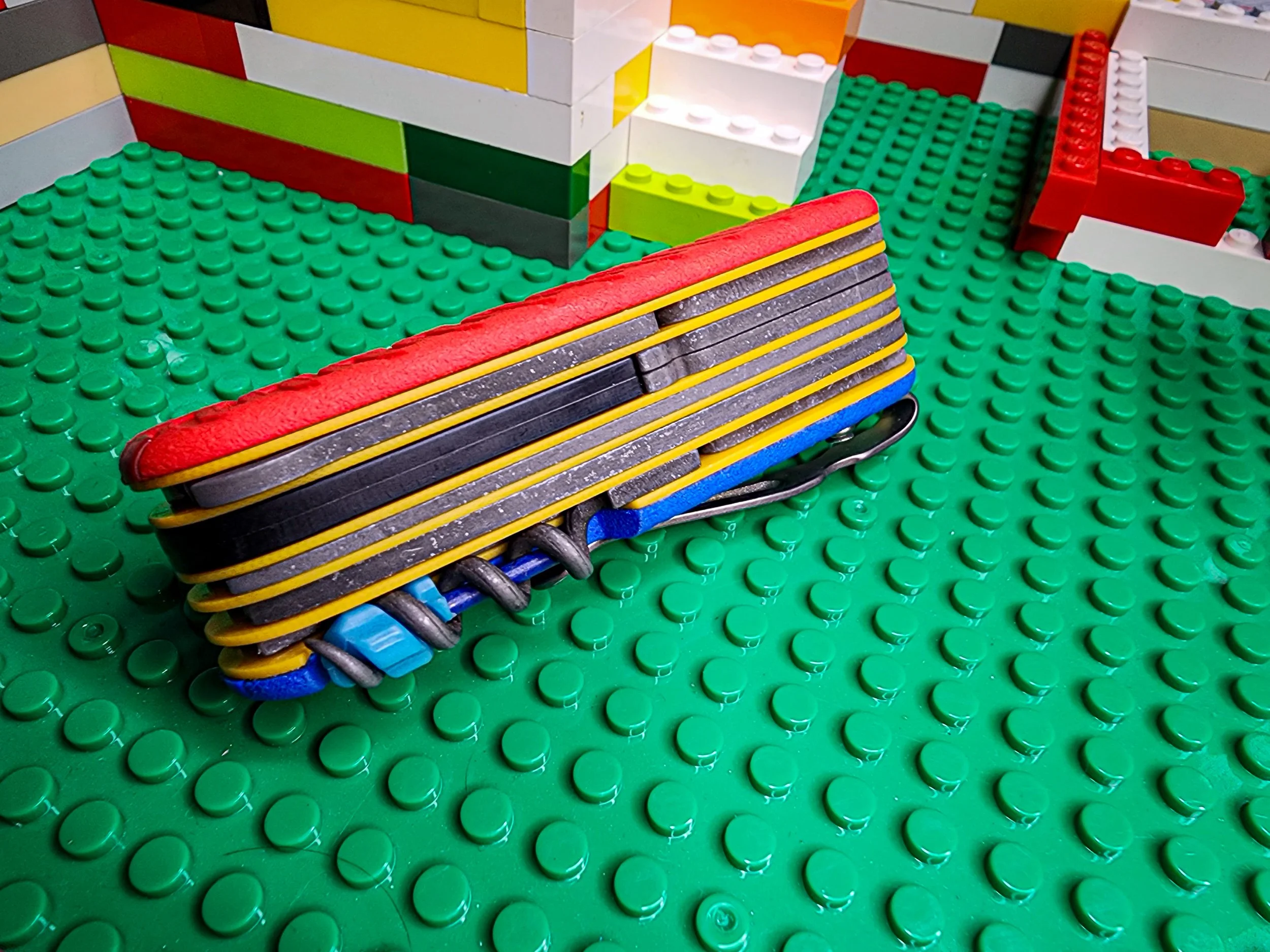 The base for this build was the Victorinox Cybertool M. The pliers were replaced with the wood saw, thus the “Huntsman”. A Spyderco Dragonfly 2 blade was added on a layer of it’s own. The tools have been acid etched and aluminum washed. The liners are yellow G10 and the scales are blue and red plastic/nylon.