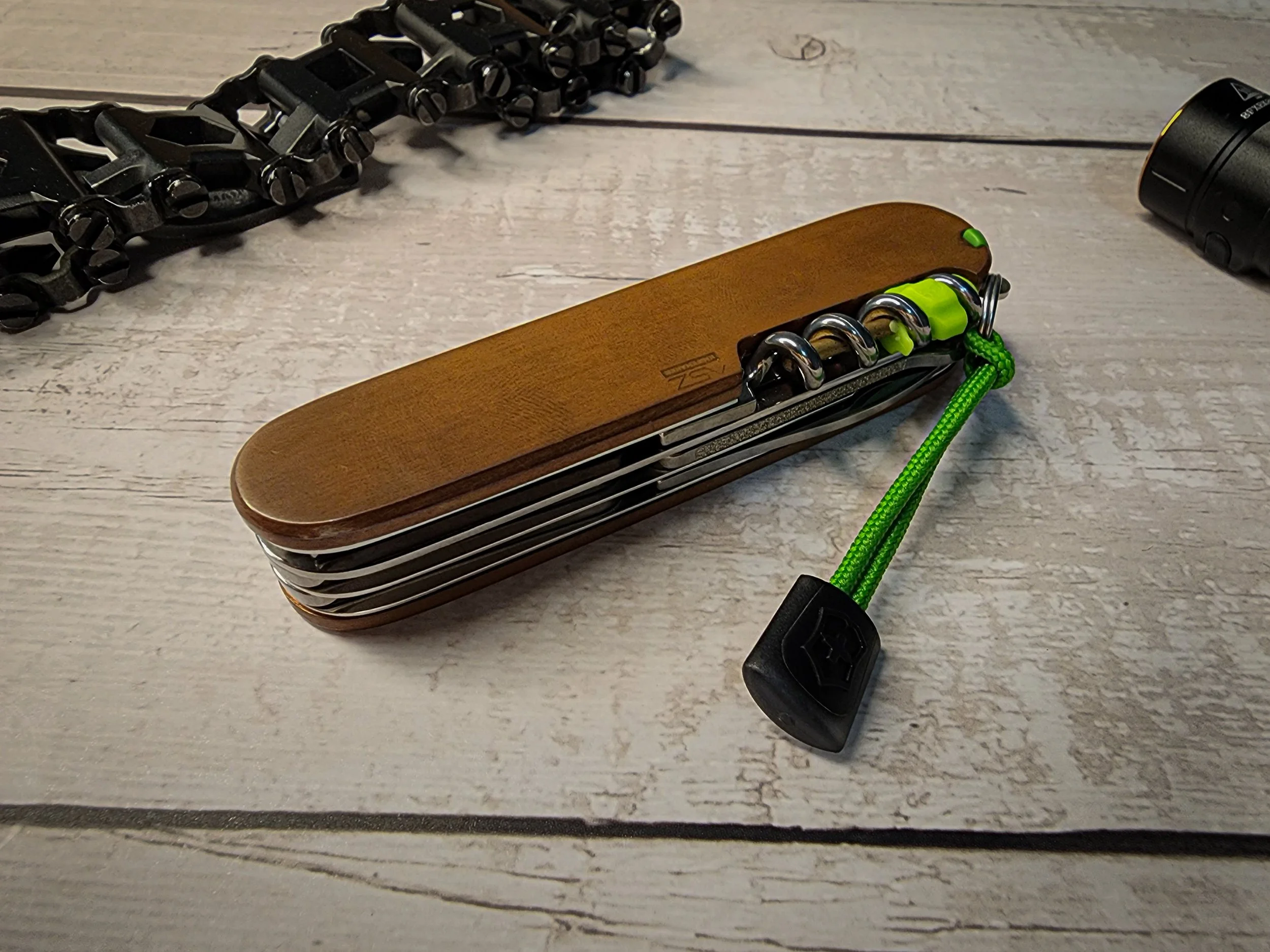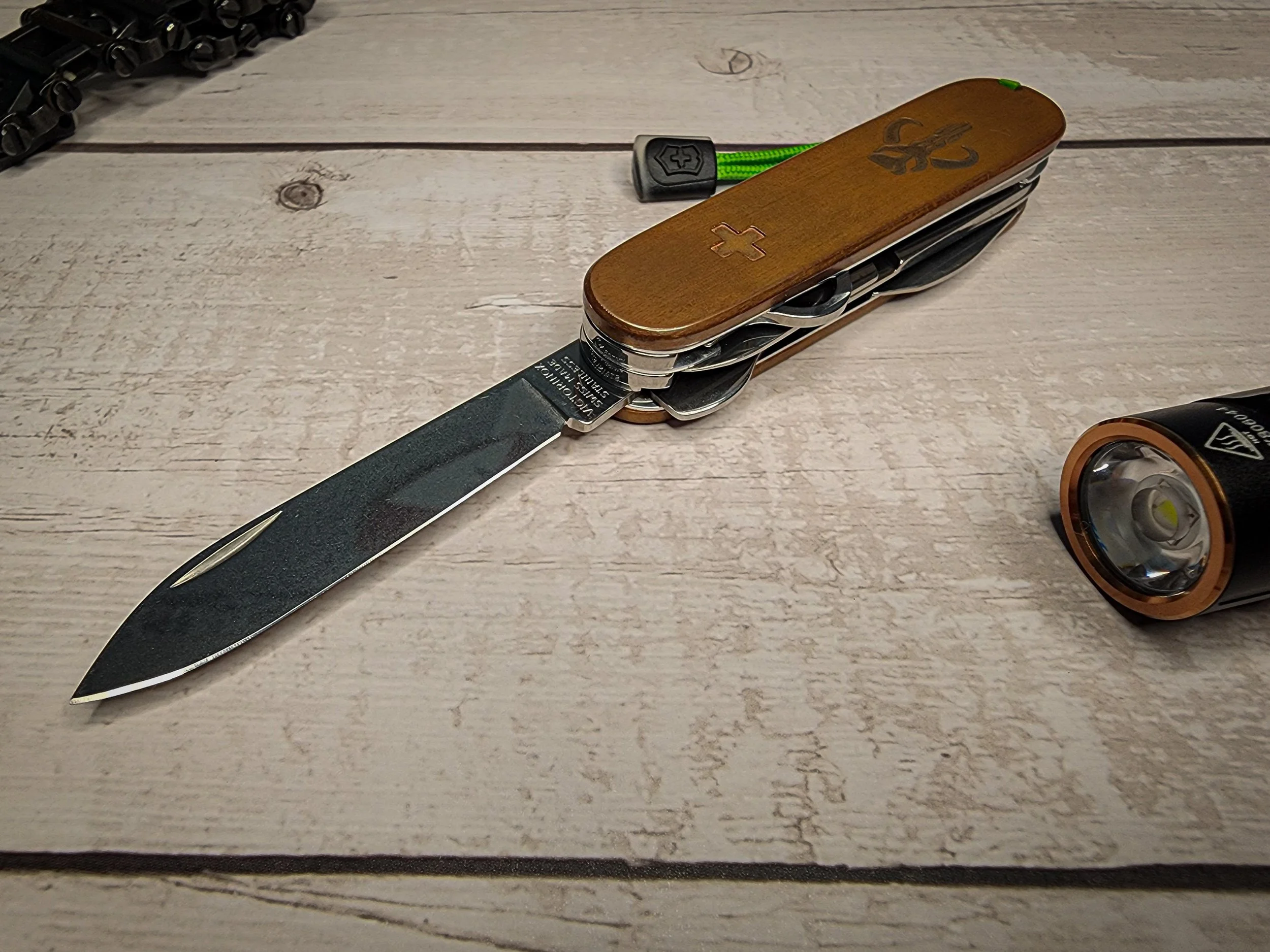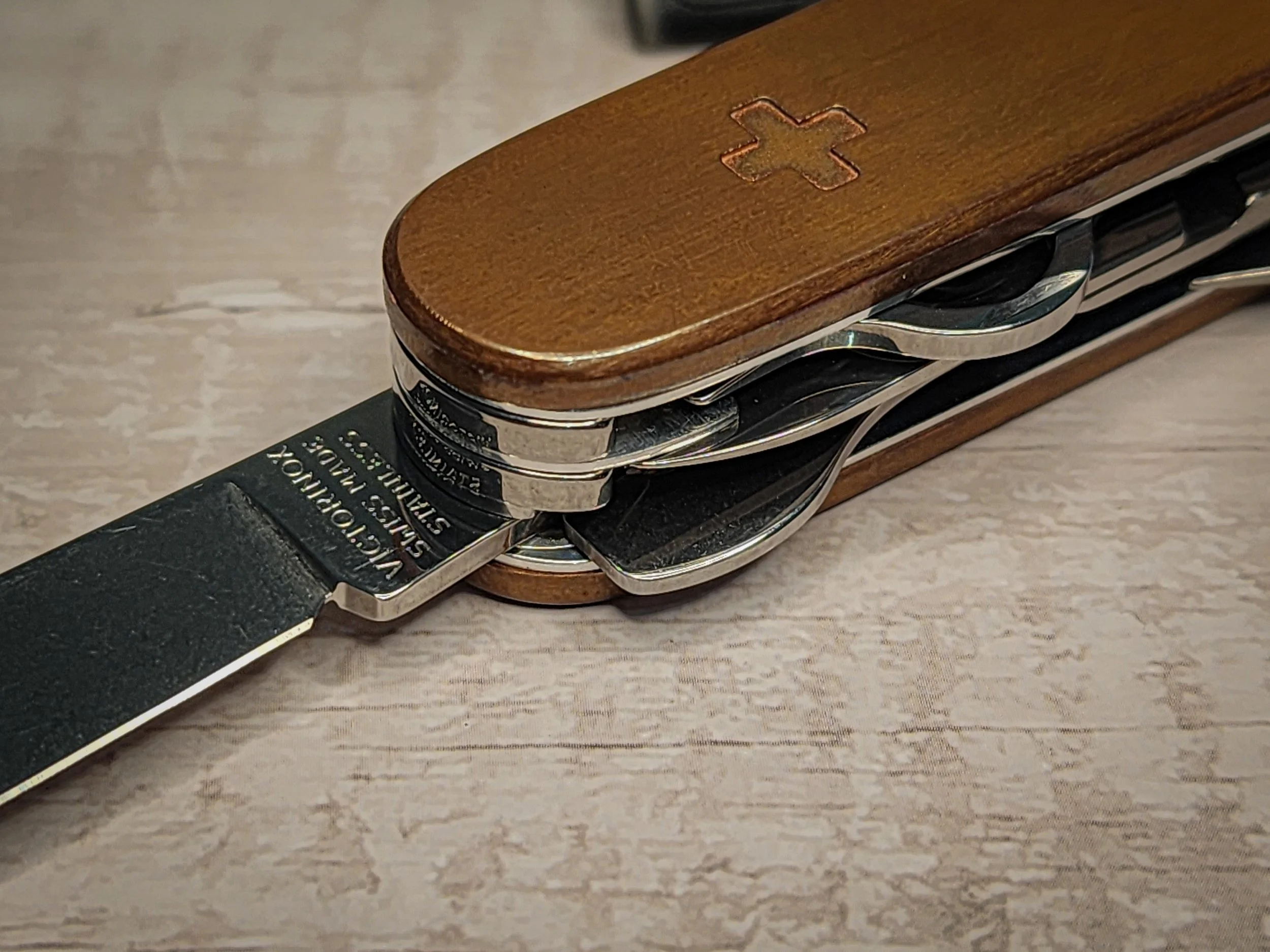 The base for this build was a Victorinox Compact. A liner lock was added to the original blade. A Wenger style magnifying glass was added along with copper scales from ASZ knifemaker.