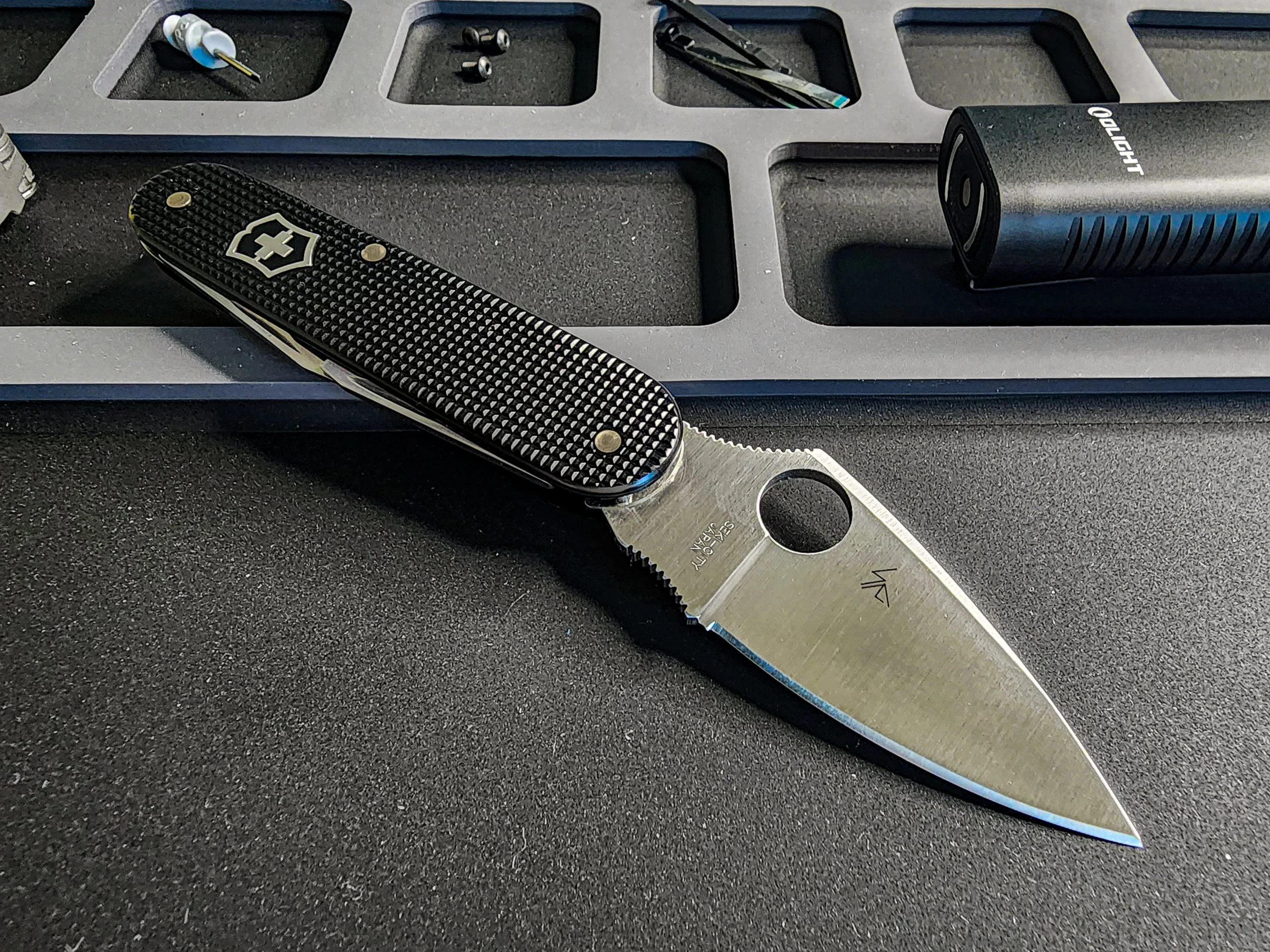 The base for this build was a Victorinox Cadet. The original blade was replaced by a Spyderco Dragonfly 2 blade. The scales are original black alox.