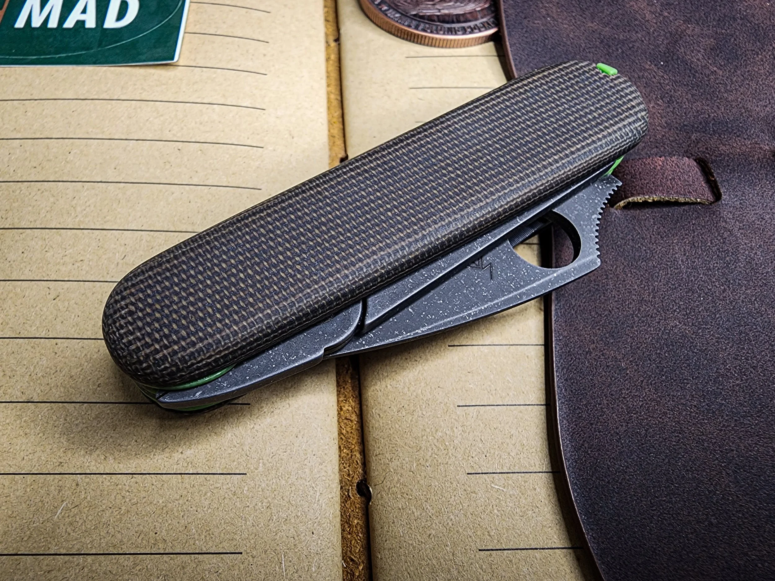 This build has a unique toolset. A Spyderco Dragonfly 2 blade and 84mm nail file were added. The liners are green g10 and the tools have been acid etched and aluminum washed. The scales are micarta plus scales from Taschenmesser MAD.