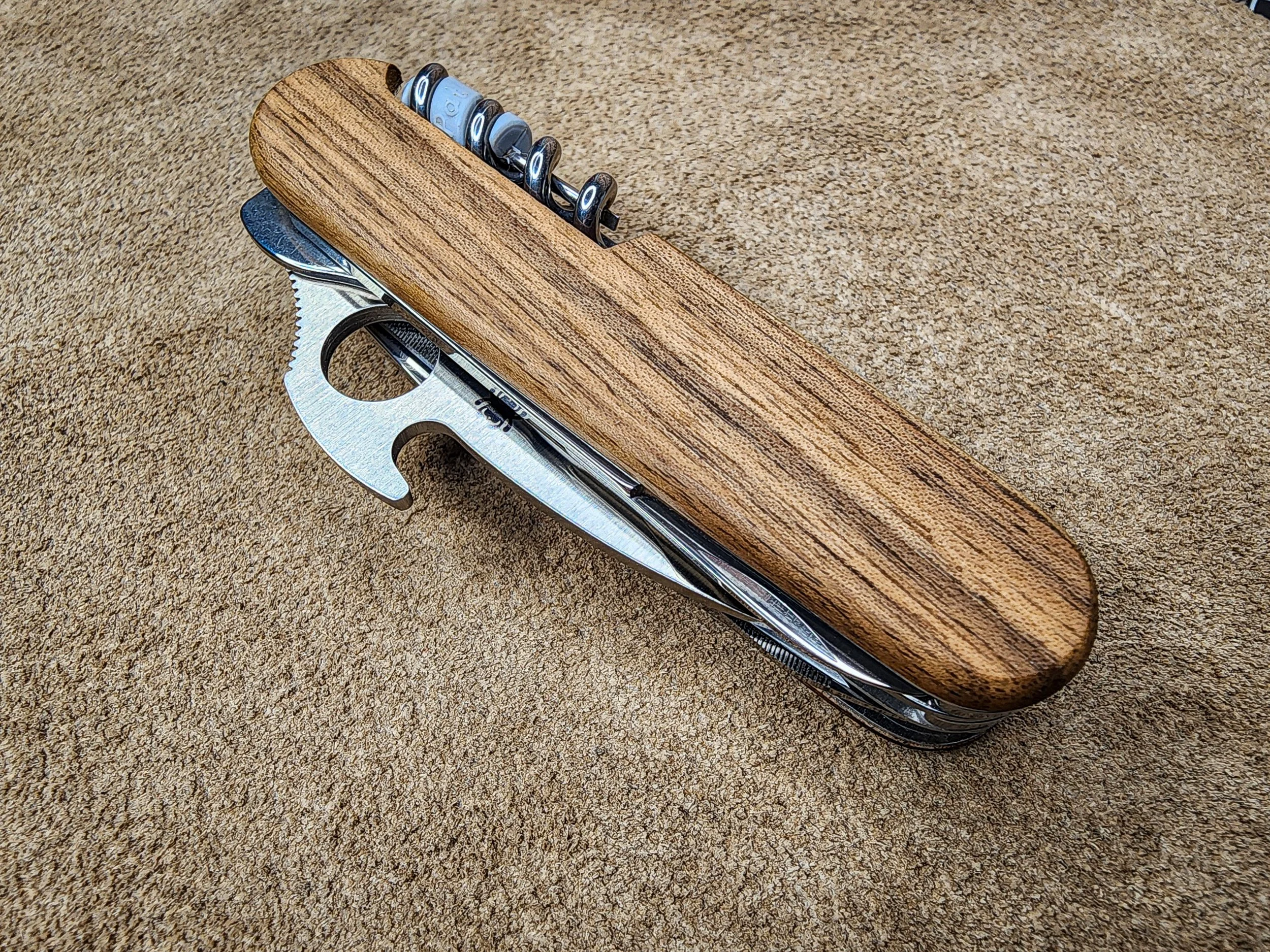 The base for this build was a Victorinox Mountaineer. A Spyderco Dragonfly 2 Emerson blade was added on a layer of its own and has a liner lock. The scales are original hard wood and a Swissqlip was added.
