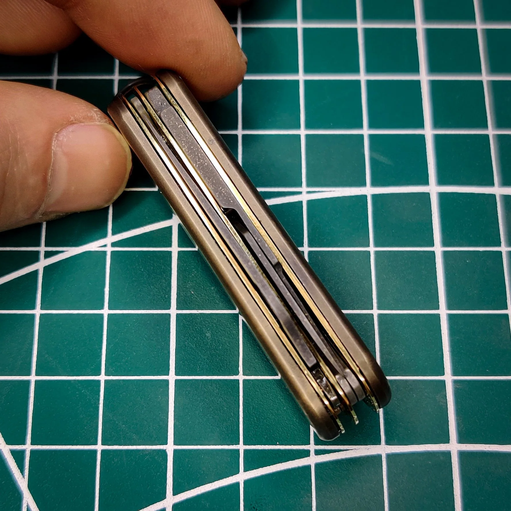The base for this build was a Victorinox Caddy. A Spyderco Honeybee replaced the original blade and a file was added. The tools have been acid etched and brass washed. The liners are brass and the scales are also brass.