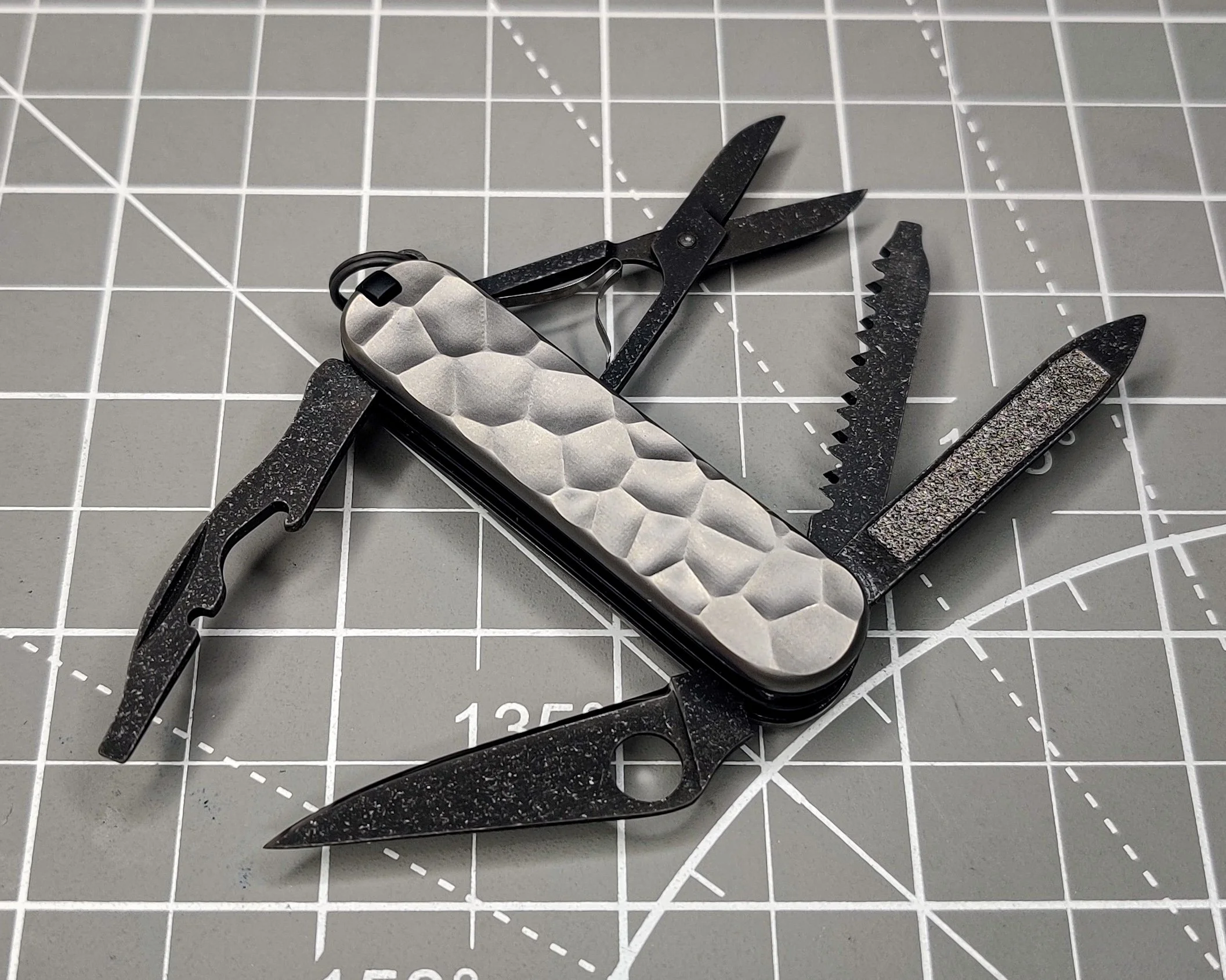 The base for this build was a Victorinox Rambler. The combination tool has a flathead instead of the standard philips screwdriver and a Spyderco Honeybee replaced the original blade. This build also has my signature saw mod. The tools have been acid etched and aluminum washed. The liners are black G10 and the scales are titanium with a stone pattern.