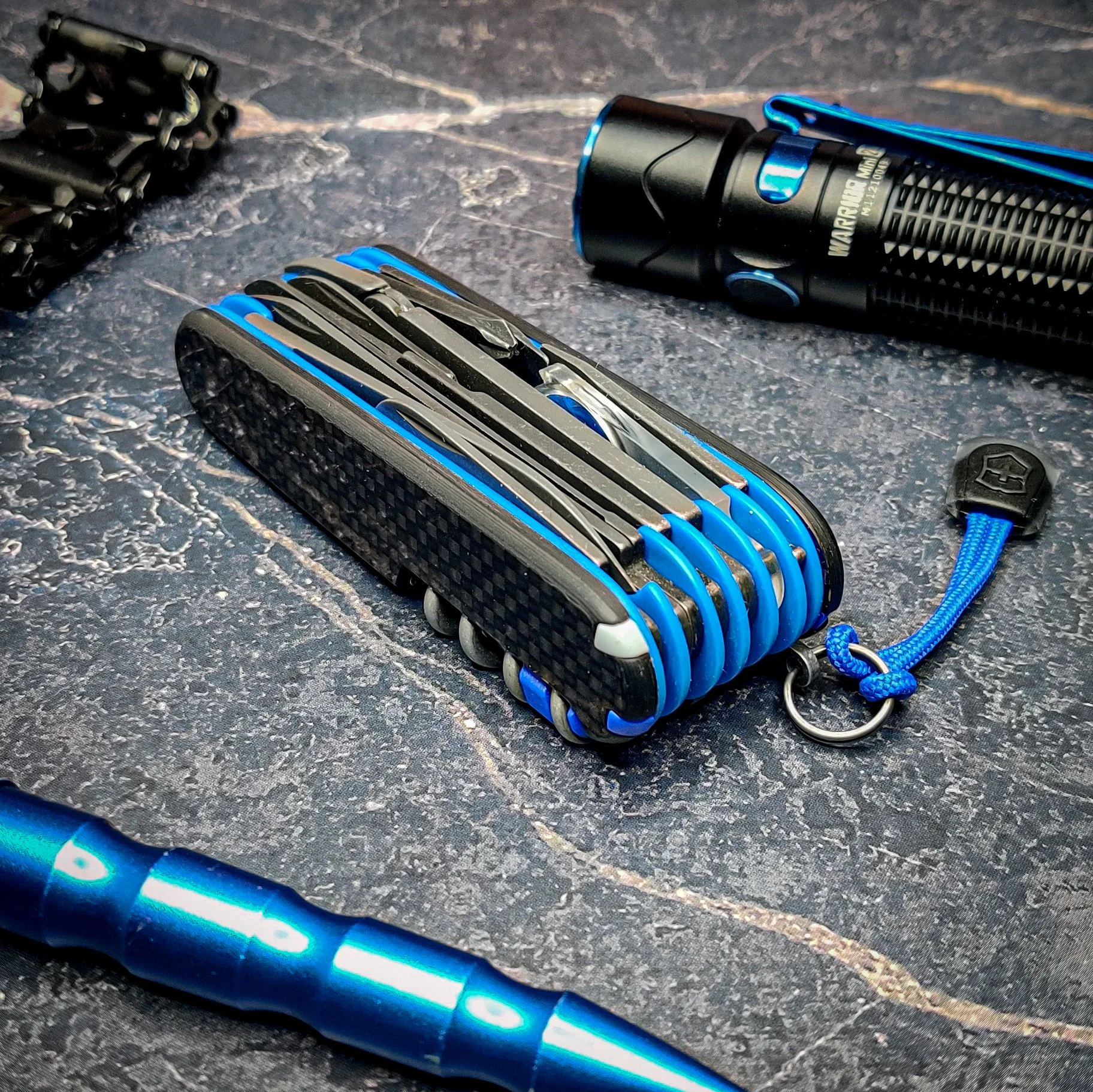 The base for this build was a Victorinox Swisschamp. A Pruner blade from a 93mm Victorinox Swiss Army 7 replaced the original small blade and the fish descaler was removed. The tools have been acid etched and stone washed. The liners are blue G10 and the scales are carbon fiber plus scales.