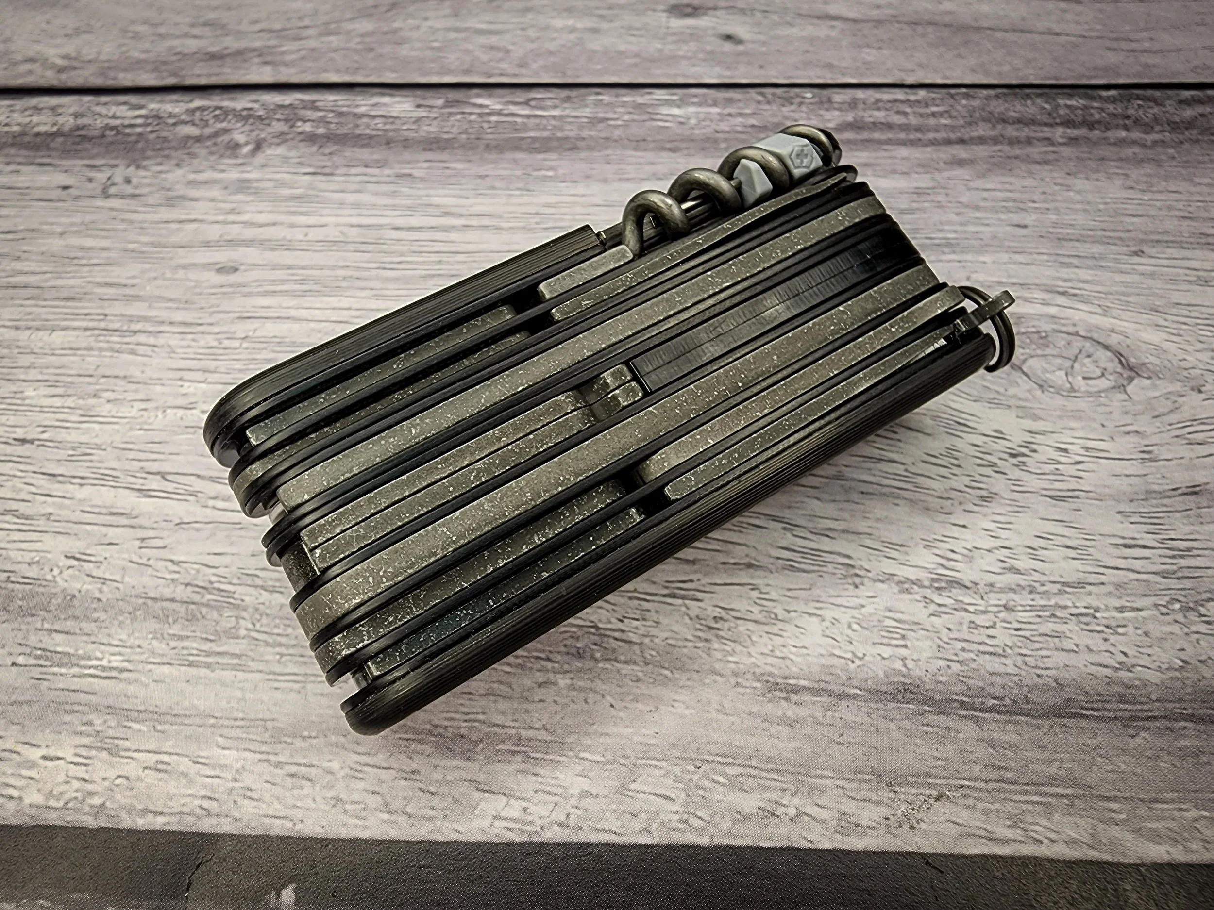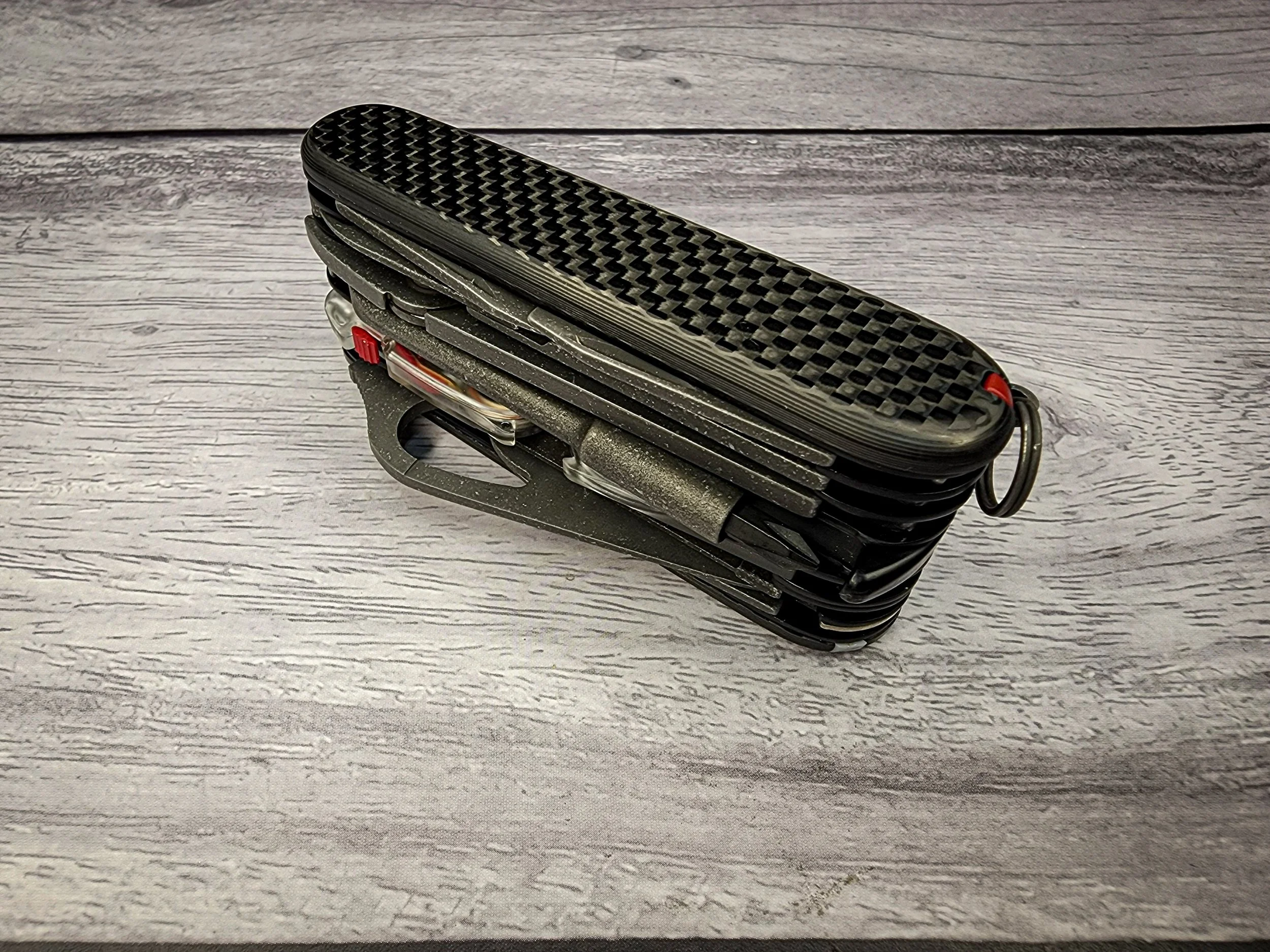 The base for this build was a Victorinox Cybertool Lite. The original blade was replaced with a Spyderco Byrd Robin 2. A wood saw was added to this toolset. The tools were acid etched and aluminum washed. The liners are black G10 and the scales are carbon fiber plus scales.