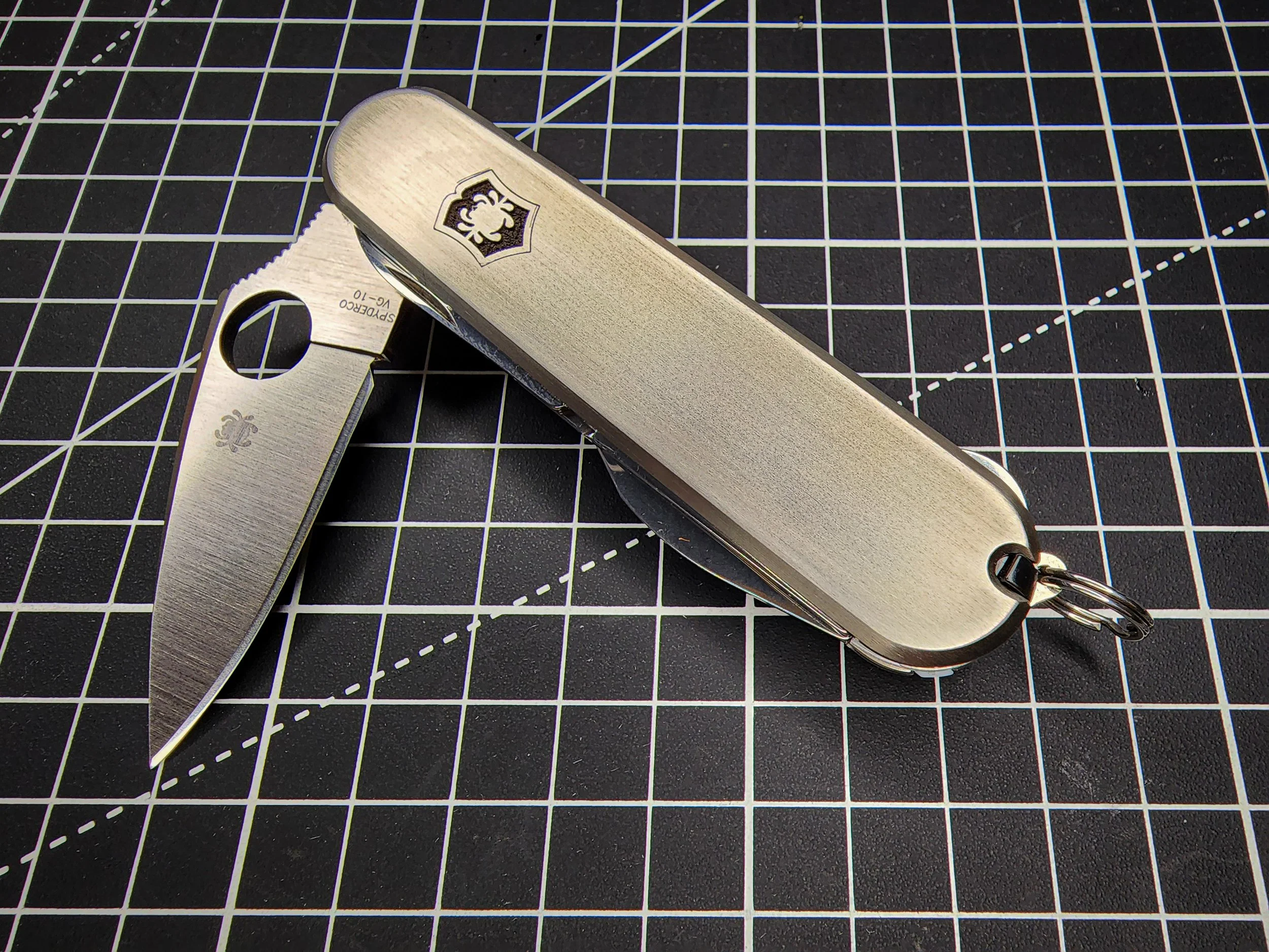 The base for this build was a Victorinox Compact. The original blade was replaced with a Spyderco Dragonfly 2 blade and the scissors are from a 93mm SAK so that the nail nick would be on the outer side making it more accessible. The scales are titanium plus scales from Metonboss with a titanium deep carry pocket clip and my Dragonox logo deep engraved.